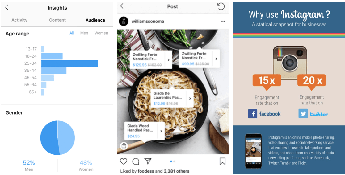If you're wanting to target a younger demographic 25-35, Instagram has a better engagement rate for that age group than Facebook, which generally results in higher quality leads to a website. If you're a product based company, you can also create shoppable images which a person can purchase directly from on Instagram :- making it even easier for the end user.