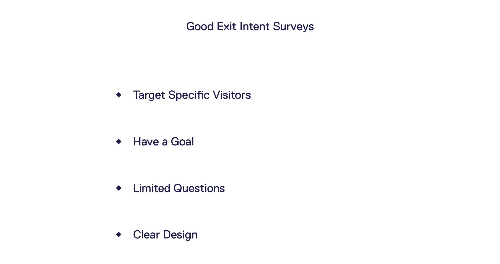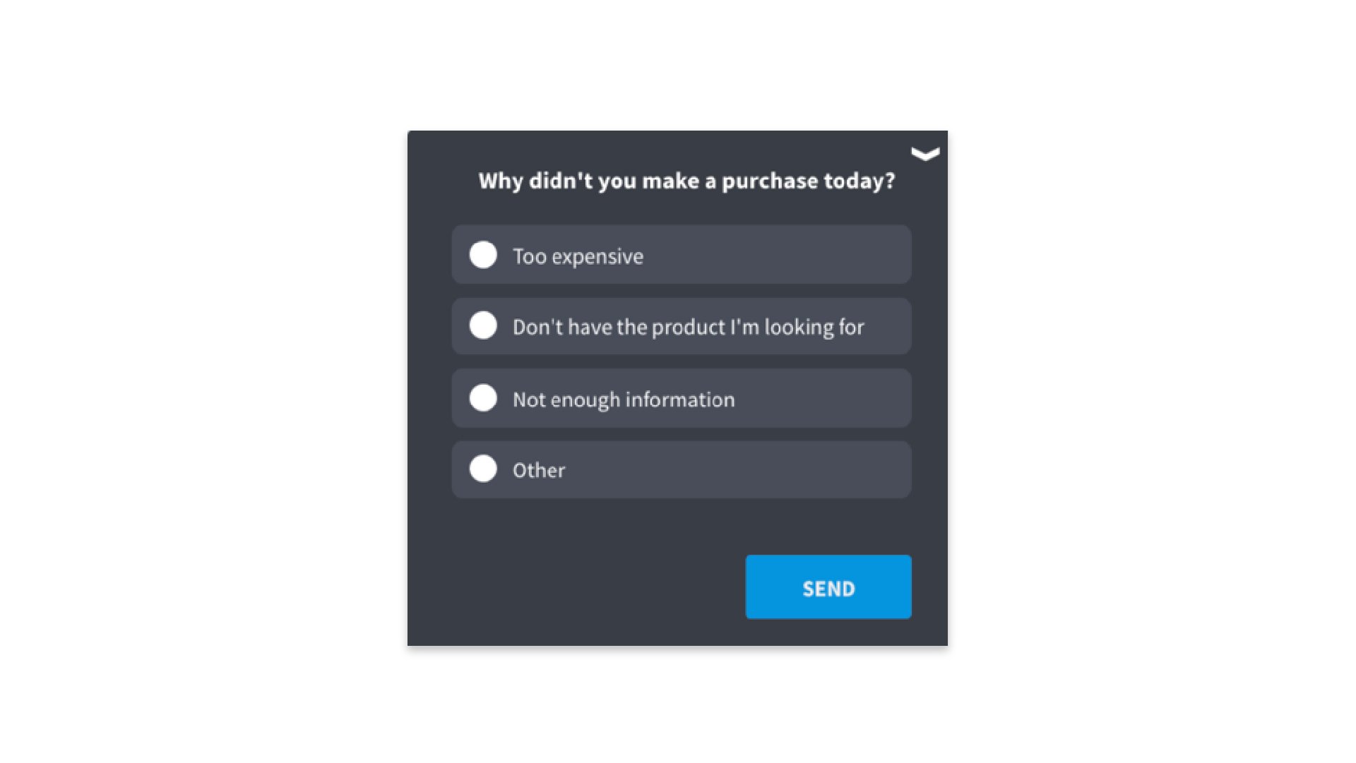 Most goals for exit intent surveys include reducing cart abandonment, reducing bounce rates, understanding why people purchased from you, or getting feature ideas from current customers.