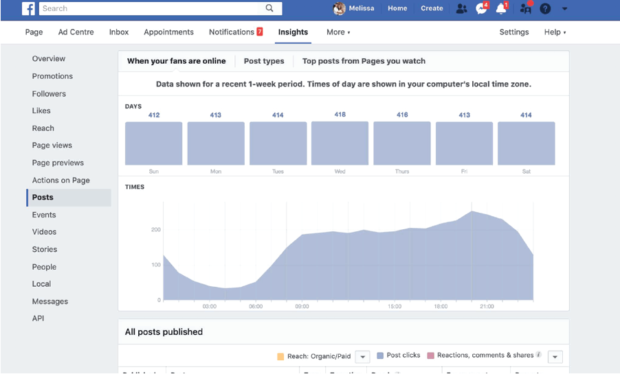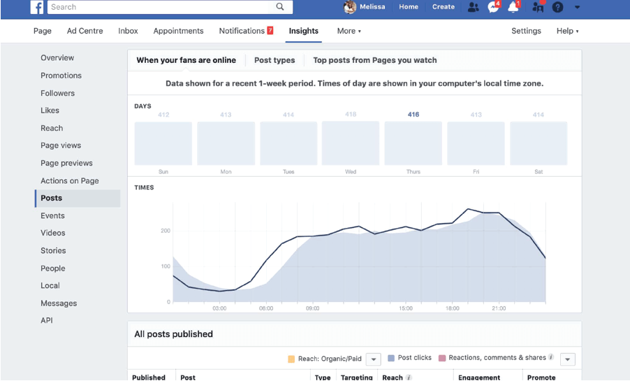 To see WHEN people are seeing your content on Facebook, click on Posts in the left menu.